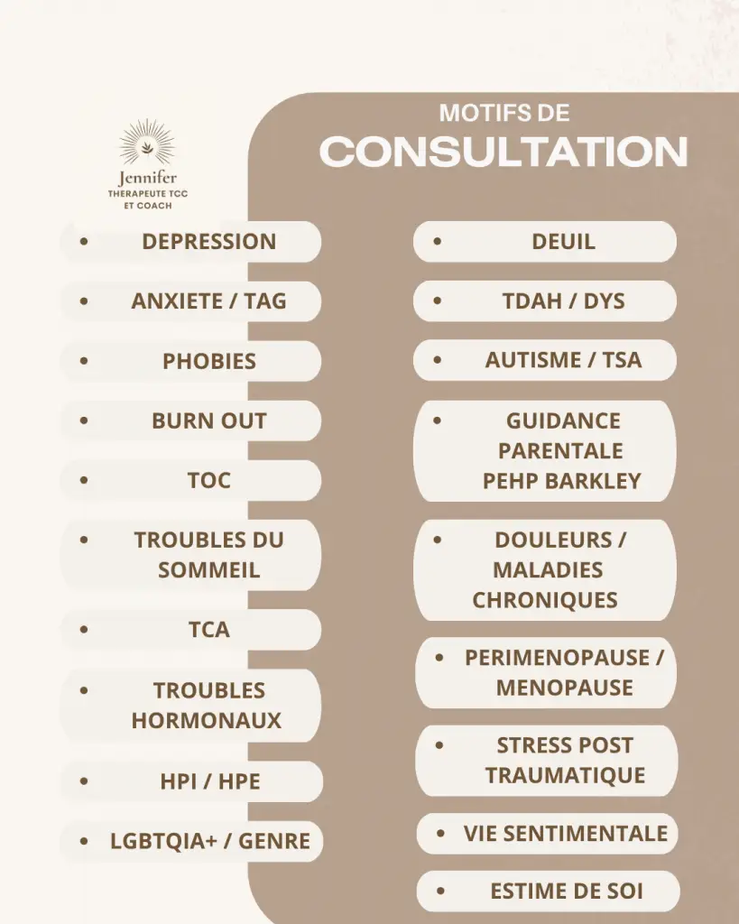 Troubles Anxieux, Troubles Emotionnels, Guidance Parentale BARKLEY, Ménopause, Phobies, TOC, Troubles du Sommeil, Troubles Alimentaires, Confiance en soi, Estime de soi, TDAH, Deuil, Douleurs et Maladies Chroniques, Burn-Out, HPI/HPE, LGBTQIA+, Genre